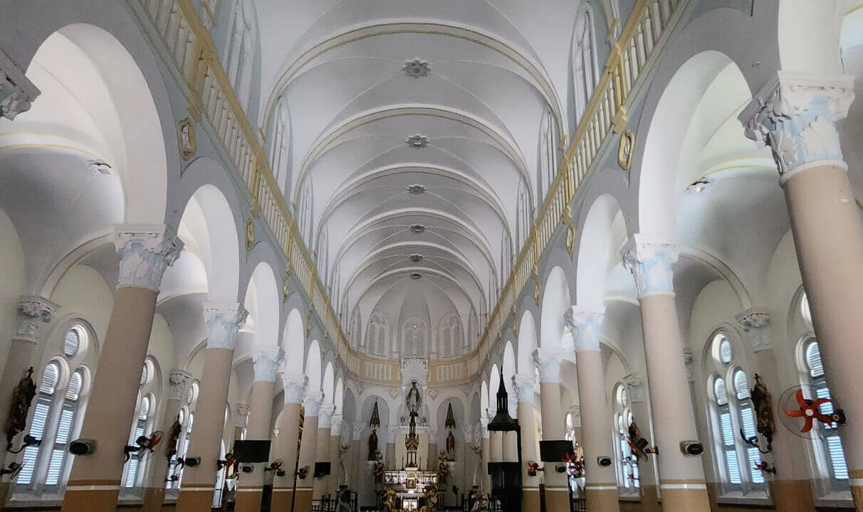 나무가 늘어선 숨겨진 섬 한가운데에는 고대 서양식 성당이 눈에 띄며 방문객에게 깊은 인상을 남깁니다. 사진: T.T