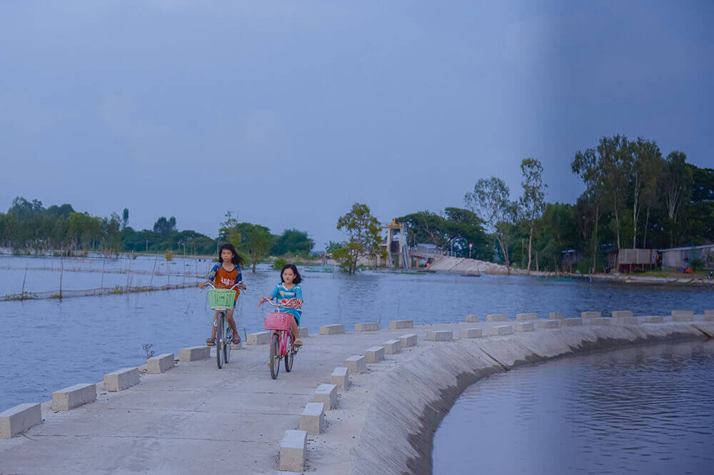 시원한 오후에는 많은 어린 아이들이 부모님과 함께 자전거를 타고 제방 주변을 돌며 들바람을 즐깁니다.