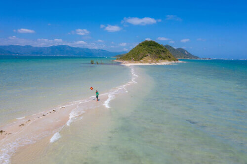 바닷물이 빠지면 두 섬을 잇는 하얀 띠가 서서히 모습을 드러내며 맑고 푸른 바다 아래 구불구불한 모래길을 이룬다. 사진: Trinh Minh Dai Anh
