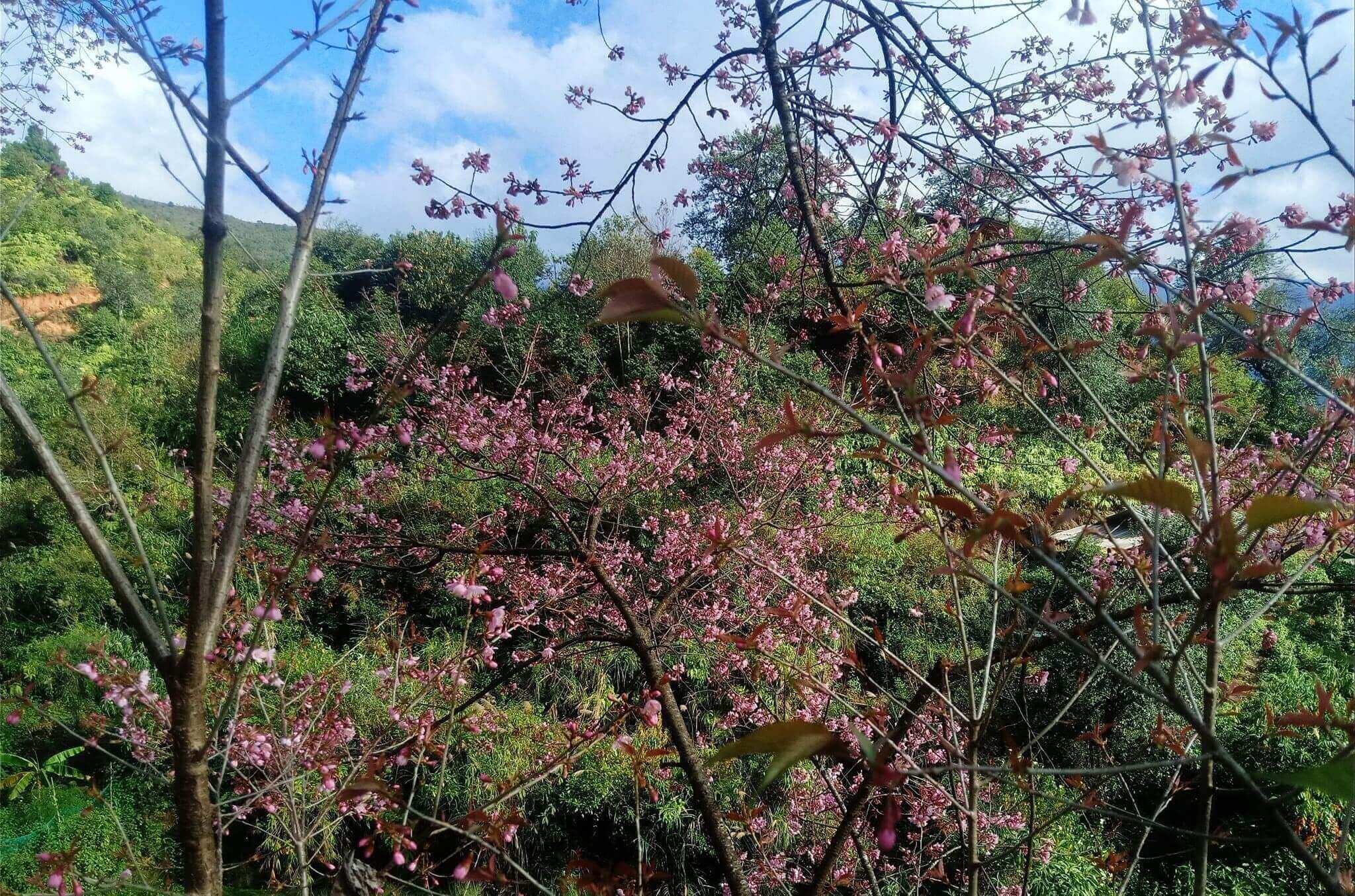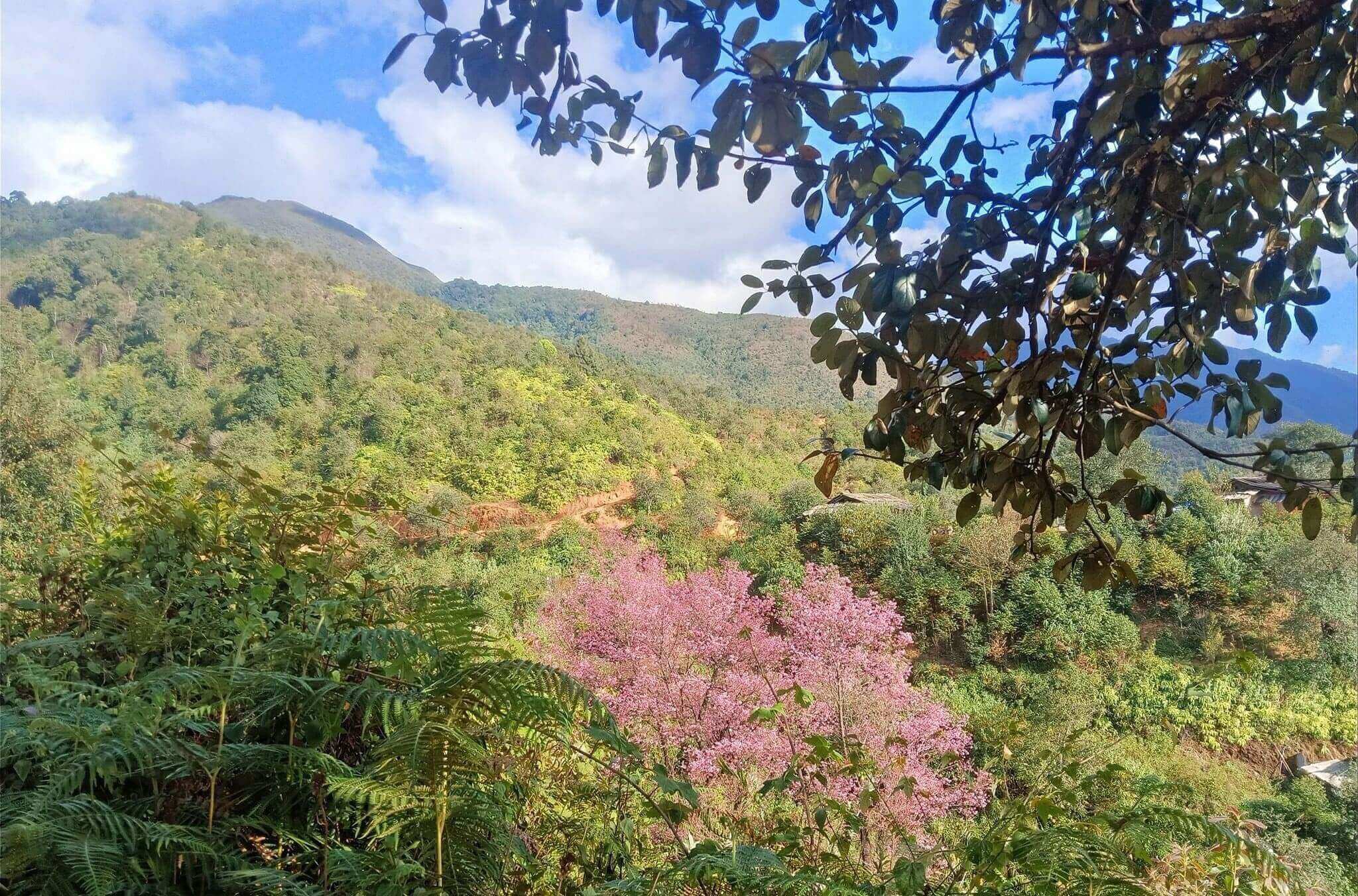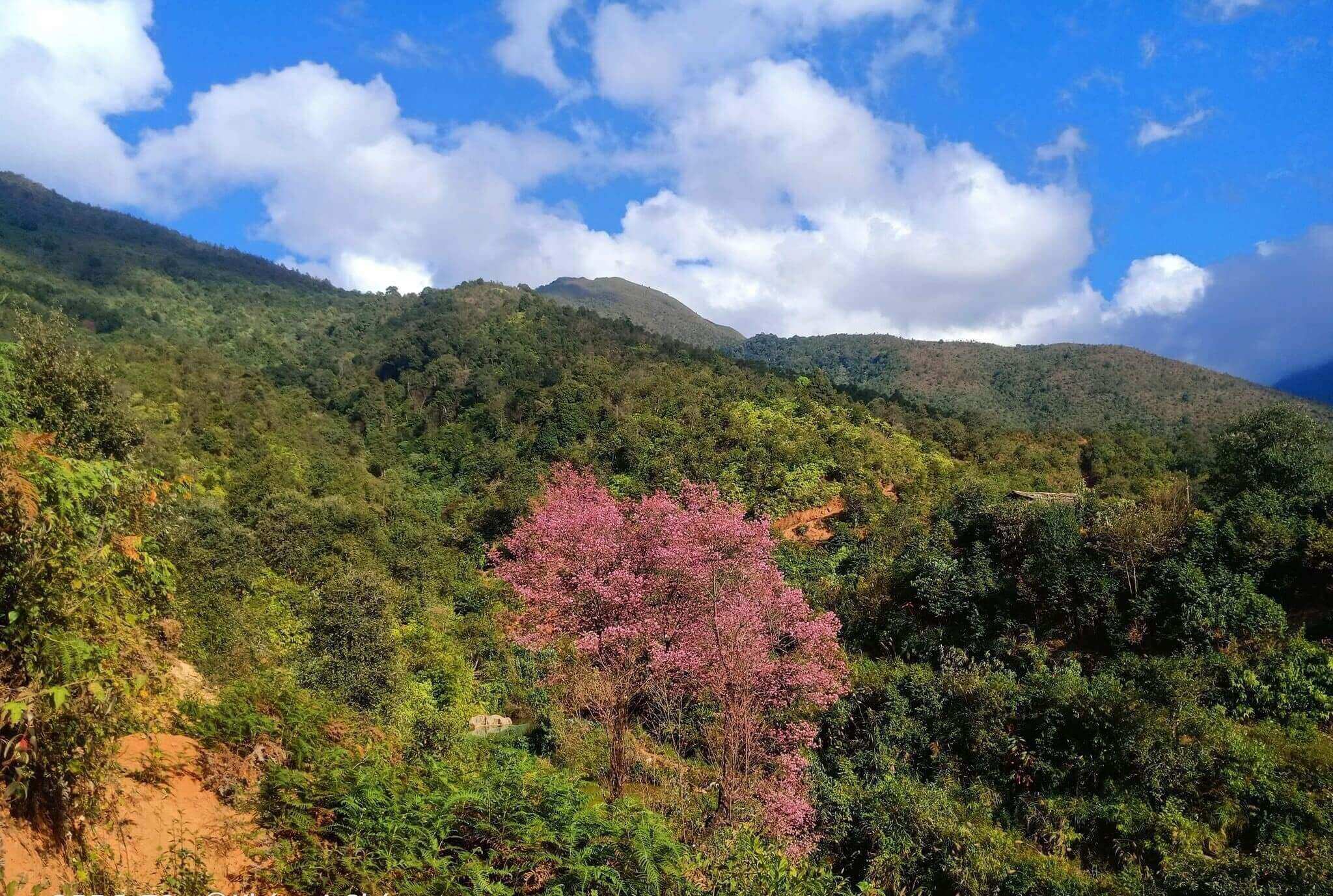 산 중턱에는 몽족 마을인 남응히엡(Nam Nghiep)이 자리잡고 있는 곳으로 곳곳에서 붉고 화사한 분홍빛 꽃을 볼 수 있다. 사진: Khang A Trang,Nam Nghiep 마을