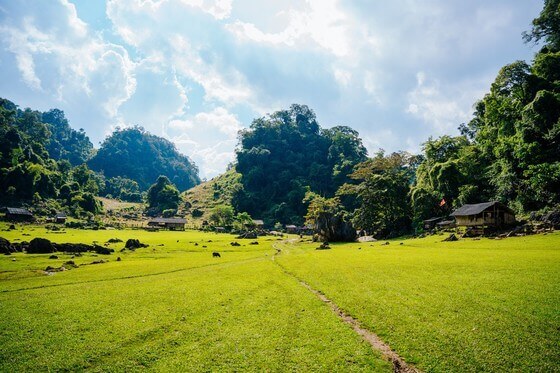 산으로 둘러싸인 푸른 잔디,뛰어다니는 몇 종류의 소,멀리에는 전통 수상 가옥이 있어 항타우 목짜우의 평화롭고 생기 넘치는 자연 풍경을 만들어냅니다.