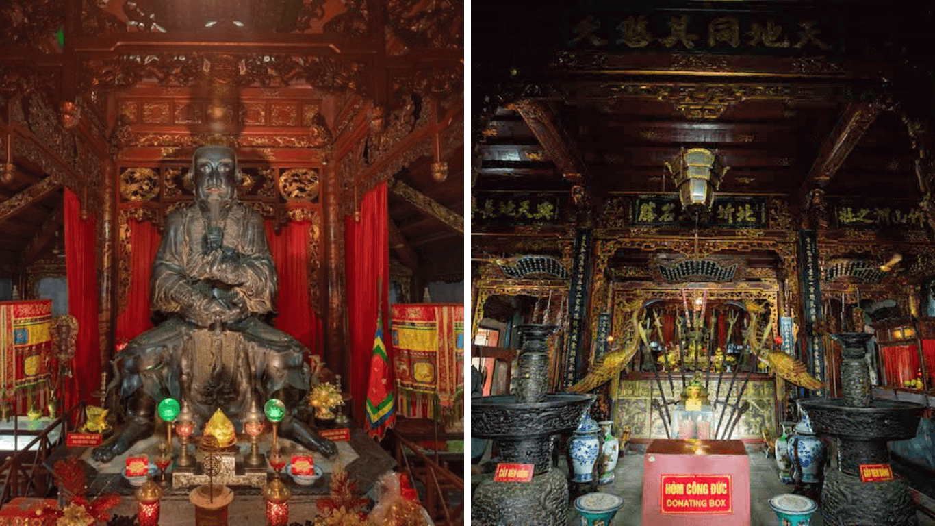 Bên trong đền,tượng Huyền Thiên Trấn Vũ bằng đồng cao hơn 3 mét và nặng gần 4 tấn là điểm nhấn đặc biệt,thu hút sự chú ý của du khách. Đây là tác phẩm điêu khắc xuất sắc,minh chứng cho kỹ thuật đúc đồng vượt trội của người Việt cách đây hơn 300 năm. Khuôn viên đền với không gian xanh mát và yên bình,cùng những văn bia khắc ghi các dấu mốc lịch sử,mang đến cho người tham quan cảm giác thư thái và tôn kính.