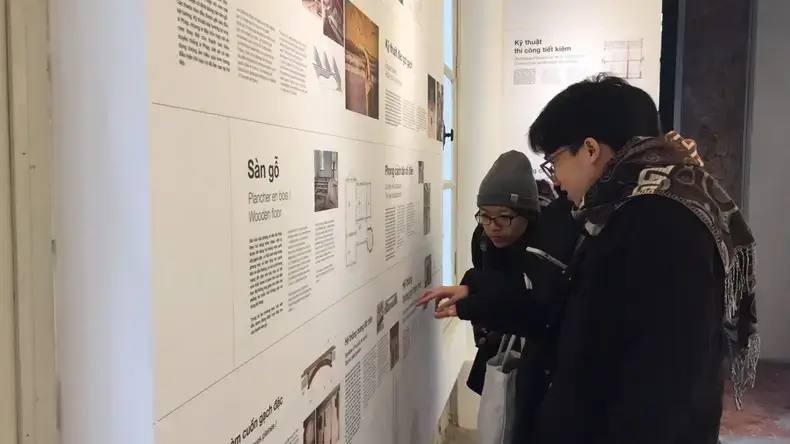 Bước vào trong căn biệt thự ngay tầng 1 là kiến trúc được tạo nên bởi gạch mette trắng hình lục lăng nhập từ pháp. Dù mỏng nhưng vô cùng chắc chắn ít nứt vỡ và không tráng men. Trần của tầng 1 được tạo thành từ các cột thép gọi là xà dọc phủ một lớp thép để gia tăng sự chắc chắn. Không gian bên trong tầng 1 của căn biệt thự được quy hoạch lại để trở thành một bảo tàng trưng bày bộ ảnh "Hồi sinh một biệt thự cổ ở Hà Nội" của nhiếp ảnh gia Francois Carlet-Soulages thể hiện toàn bộ quá trình biến đổi của biệt thự,từ lúc còn là một căn biệt thự bỏ hoang,các cuộc giám sát,nghiên cứu của các nhà khoa học… Cho tới từng bước trong quá trình tu bổ,thiết kế. Ngoài ra bên trong khuôn viên tầng 1 còn trưng bày thêm các viên gạch dùng để xây biệt thự,chốt cửa sắt,sứ cách điện,vật liệu trang trí bằng đất nung.