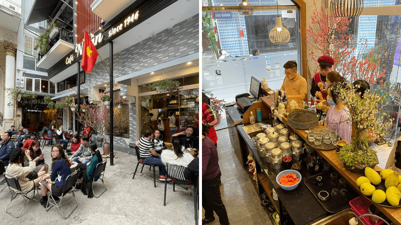 Cà phê Nhân,nằm tại số 39D Hàng Hành,là một trong những địa chỉ cà phê lâu đời nổi tiếng ở Hà Nội. Được thành lập từ năm 1946,quán đã gắn bó với người dân thủ đô qua nhiều thế hệ. Vốn được yêu thích nhờ vào sự kết hợp hoàn hảo giữa không gian lịch sự và các thức uống đậm đà,quán là nơi lý tưởng để bạn thưởng thức một ly cà phê truyền thống,đặc biệt là khi bạn muốn tìm về những giá trị văn hóa lâu đời của Hà Nội. Từ khi mở cửa cho đến nay,Cà phê Nhân vẫn giữ vững được hương vị và phong cách phục vụ như những ngày đầu tiên.