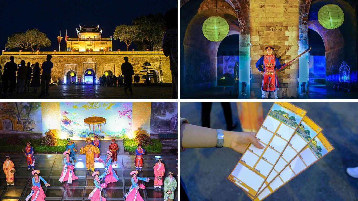 Buổi tối bắt đầu lúc 19 giờ,khi du khách tập trung tại di tích Đoan Môn - cổng chính vào Cấm thành,đây từng là nơi ở và làm việc của các vị vua xưa. Trên con đường rộng lớn này,du khách có cơ hội bước chân trên lối đi từng dành riêng cho vua chúa,mang lại cảm giác lịch sử sâu sắc. Khi vào trong Đoan Môn,màn trình diễn nghệ thuật tái hiện Lễ thượng triều và điệu múa “Cung đình Thăng Long” sẽ mang đến những hình ảnh sống động về cuộc sống trong cung đình xưa.