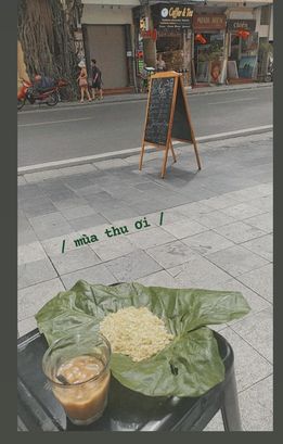 Để bắt đầu,nên thưởng thức món quà tuyệt diệu chỉ có vào mùa thu - một gói cốm non xanh mướt mắt,hạt cốm dẻo mềm thơm lừng ủ trong chiếc lá sen tựa như một gói quà tinh tế mà mùa thu dành tặng. Nhâm nhi hương cốm,hớp ngụm café ngắm dòng người qua lại trong lòng phố cổ,bạn sẽ thấy cuộc đời trôi qua nhẹ bẫng chẳng chút ưu tư.
