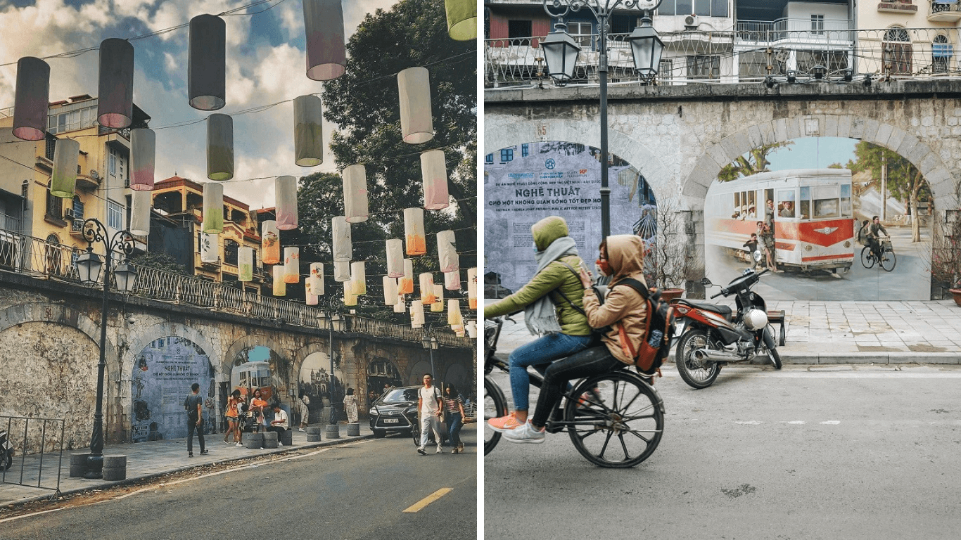 Sau khi thăm quan phố bích họa,bạn có thể kết hợp ghé thăm các địa điểm nổi tiếng gần đó để chuyến đi thêm phần thú vị. Chợ Đồng Xuân là lựa chọn tuyệt vời để bạn trải nghiệm không khí nhộn nhịp,mua sắm đặc sản Hà Nội hoặc thưởng thức các món ăn truyền thống. Ngoài ra,phố Hàng Mã cũng rất gần đó,nổi tiếng với các mặt hàng trang trí,đồ thủ công mỹ nghệ rất đa dạng. Nếu thích khám phá thêm,bạn có thể đi dạo qua phố Hàng Bông hay cầu Long Biên để tận hưởng vẻ đẹp cổ kính và lịch sử của Hà Nội.