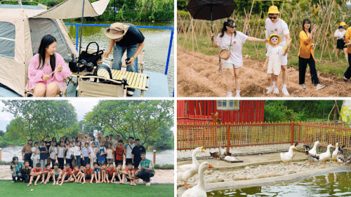 Ao bùn bắt cá rô là khu vực đông tiếng cười nhất vào buổi sáng. Bé lội nước,rượt theo cá rồi mang thành quả rửa sạch dưới vòi,chuẩn bị nướng trên bếp than sinh học. Kế bên là xưởng gốm,nơi trẻ thử xoay bàn,nặn chén và tô màu với đất đỏ Hà Nam. Tác phẩm sẽ được hong khô,đóng hộp giấy tái chế để bé mang về làm kỷ niệm.