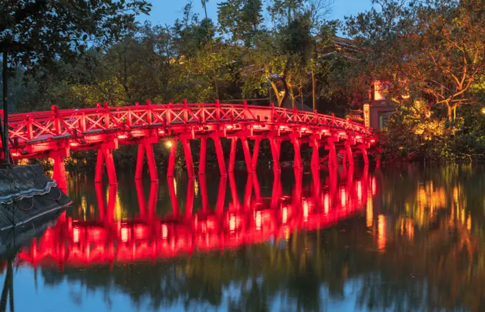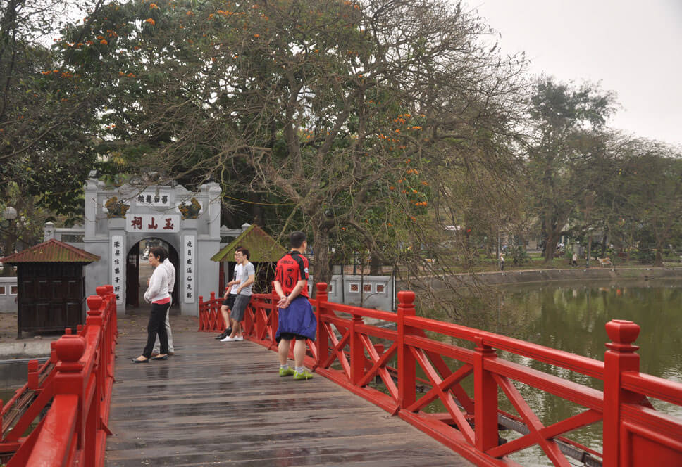 Cầu Thê Húc với sắc đỏ đặc trưng,nằm nổi bật giữa hồ Hoàn Kiếm nối với đền Ngọc Sơn. Vì sở hữu thiết kế độc đáo nên du khách lẫn người dân rất thích đến đây để check in sống ảo. Hình ảnh cầu Thê Húc in bóng xuống hồ đầy lãng mạn từ lâu đã trở thành một trong những biểu tượng của Thủ đô.