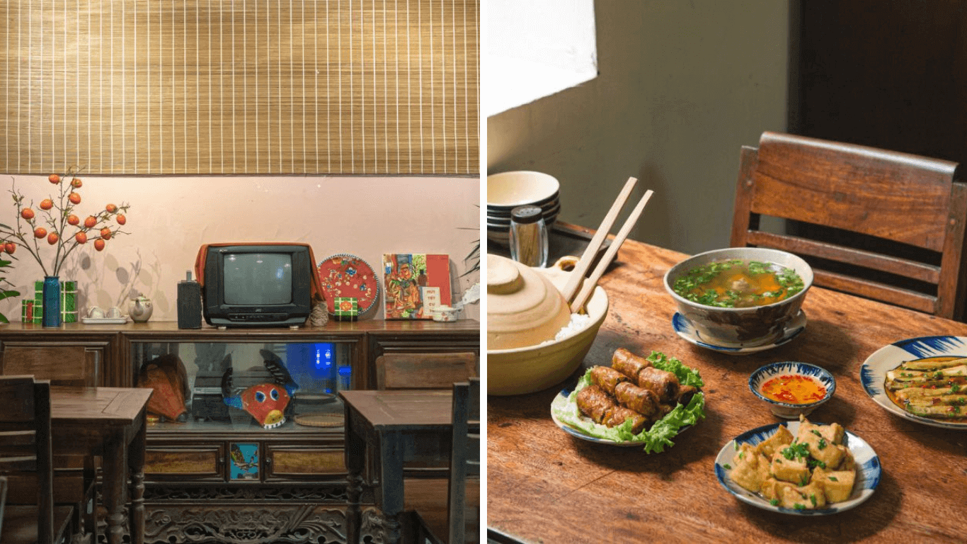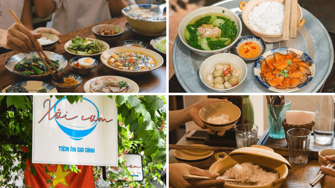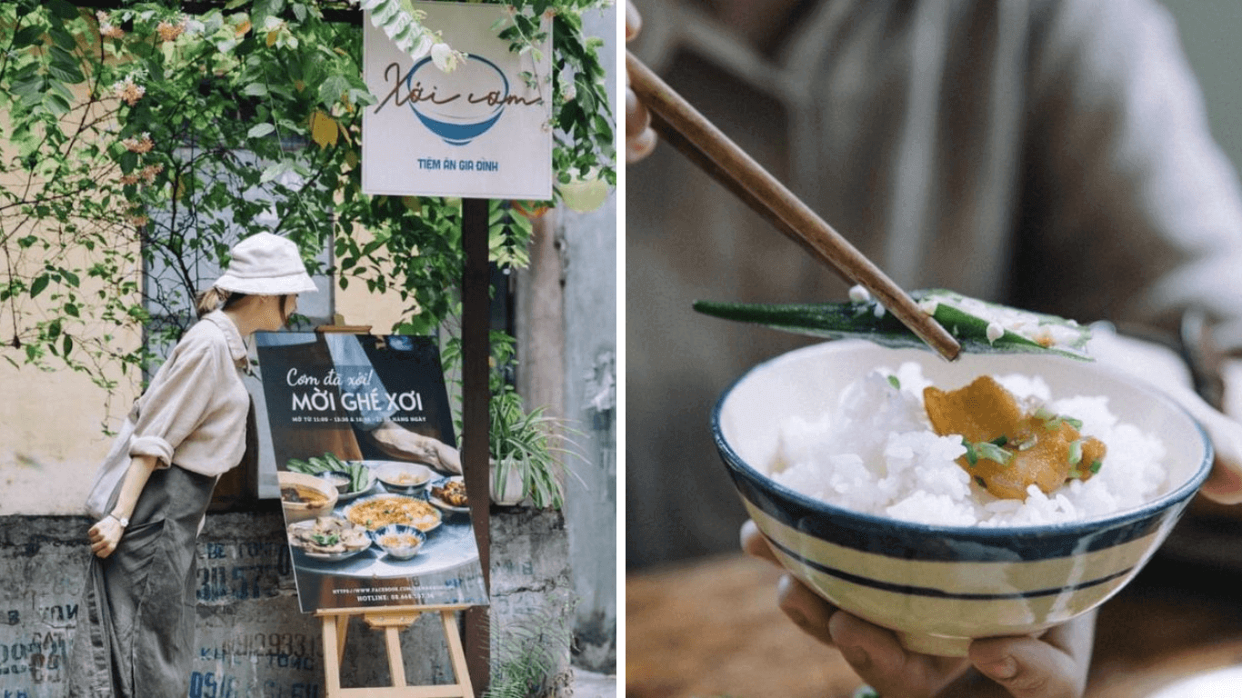 Xới Cơm,một nhà hàng nhỏ nằm trong khu tập thể cũ tại Láng Hạ,quận Đống Đa,là nơi lý tưởng để tìm lại những giá trị truyền thống của bữa cơm gia đình Việt. Không gian tại đây gợi nhớ đến ngôi nhà của những năm 1990,với những chiếc tủ gỗ cũ,tivi đời xưa và những vật dụng mộc mạc. Mâm cơm ở Xới Cơm mang đậm hương vị quê nhà,từ bát cơm trắng dẻo,các món ăn quen thuộc đến đĩa cà muối dân dã. Hương vị ấy gợi lên sự gần gũi,khiến bất cứ ai ghé qua cũng thấy lòng ấm áp và muốn quay lại.