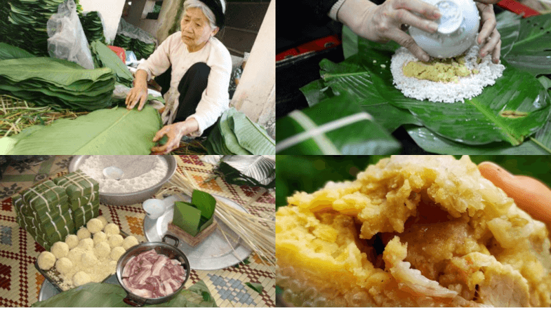 Gia vị bí truyền gồm gừng già và thảo quả hòa quyện cùng thịt lợn ba chỉ tạo nên phần nhân vô cùng đậm đà. Lớp lá dong xanh mướt bọc bên ngoài được chèn thêm cuộng dong để khi luộc xong, bánh có màu xanh ngọc cực kỳ đẹp mắt. Ngọn lửa khi luộc cũng phải được canh chừng cẩn thận để hạt nếp đạt độ chín tới, vừa đảm bảo độ rền mà không bị nát.
