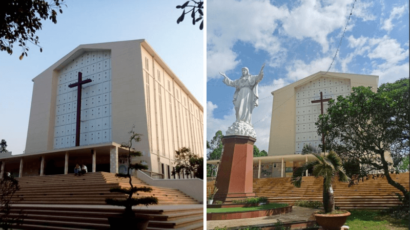 Điểm nhấn ấn tượng nhất mà bạn không thể bỏ qua chính là phần mặt tiền được thiết kế mô phỏng theo hình dáng một con tàu Kitô giáo đang vươn mình ra khơi. Trên đỉnh cao nhất của con tàu ấy là cây thánh giá khổng lồ bằng bê tông, cao tới 17m, sừng sững giữa bầu trời xanh như một biểu tượng của niềm tin và sự cứu rỗi. Những bậc thang dẫn lên tiền đường rộng thênh thang cũng là nơi lý tưởng để bạn đứng quan sát toàn cảnh sự nhộn nhịp của giáo xứ vào mỗi dịp lễ lớn.