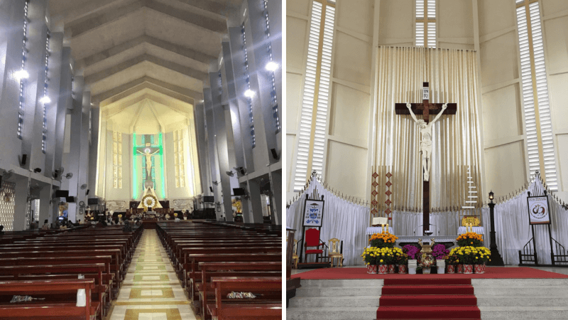 Khi bước vào phía trong, bạn sẽ cảm nhận được một luồng không khí mát mẻ và sự tĩnh lặng tuyệt đối bao trùm lên khắp các hàng ghế gỗ. Hai dãy bàn ghế được sắp xếp tăm tắp với sức chứa lên tới 2.500 người, tạo nên một không gian cầu nguyện vô cùng rộng lớn và trang trọng. Những bức tường phía trong được chạm khắc rất tỉ mỉ, phảng phất nét cổ điển của Châu Âu nhưng vẫn có sự gần gũi, quen thuộc của tâm hồn người Việt.